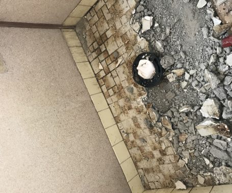 トイレ内部は大変汚れていますが、1階にウジが落ちている状況を考えると、床下に問題があると考えて、便器を外して床を斫っていきます。